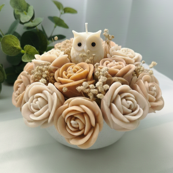 Arreglo floral tazón redondo rosas y búho